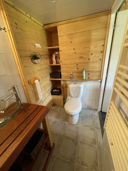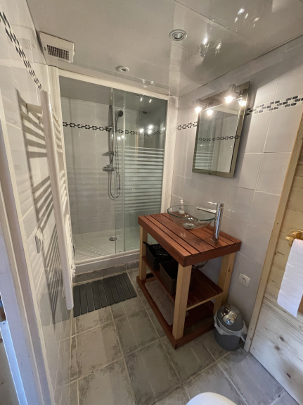 La salle de bain est équipée, d'une douche, vasque et WC.