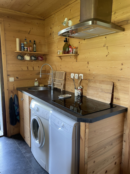 Il dispose d'une cuisine équipée avec plaques induction, réfrigérateur, mini four, four micro-ondes, lave-vaisselle, lave-linge, cafetière filtres, cafetière Nespresso, bouilloire électrique, grille-pains, appareil à raclette.
