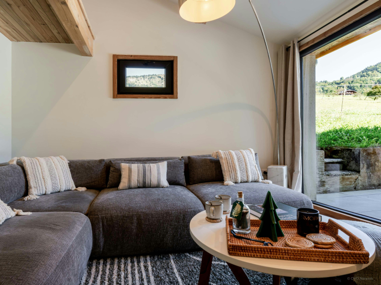 Dès l’entrée, un salon accueillant, meublé d’un canapé d’angle et d’une télévision, invite à se mettre à l’aise. Quelques marches mènent à la grande pièce de vie, un espace ouvert en L, baigné de lumière, réunissant une cuisine équipée, une table à manger et un coin salon, où des canapés font face à un panorama exceptionnel sur les montagnes. À l’extérieur, une terrasse prolonge ce cadre convivial avec une table à manger, idéale pour les repas d’été.