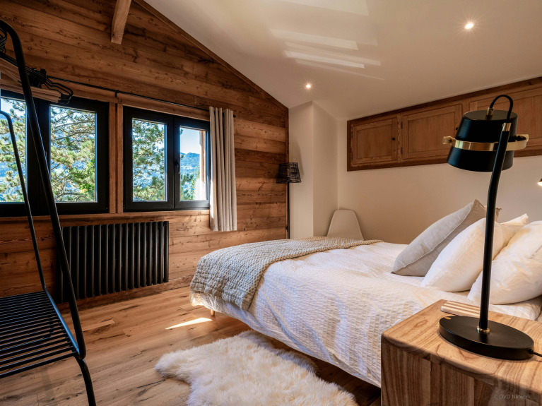 Les quatre chambres et deux salles de bains avec toilettes composant le Chalet Mushy se répartissent entre l’étage supérieur et le rez-de-jardin. Ce dernier bénéficie d’ailleurs d’une entrée indépendante très pratique.
