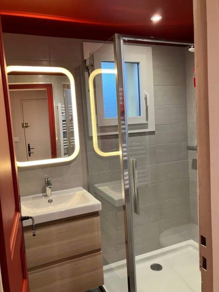 - une salle d’eau avec une douche, un meuble évier, un wc et un sèche-serviettes chauffant et soufflant.