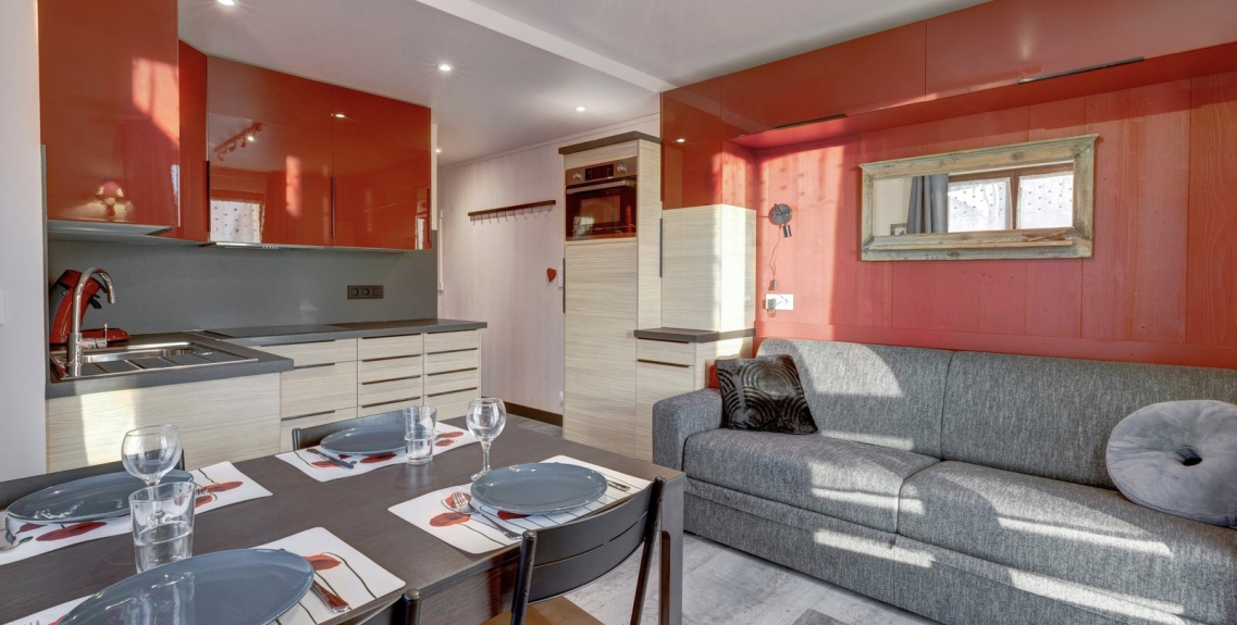 - une belle pièce de vie lumineuse avec un coin salon doté d’un canapé lit double (160cm x 200 cm) et d’une cuisine moderne, super équipée, composée d’une plaque à induction 4 feux, un réfrigérateur avec petit congélateur, un four combiné micro-ondes, un lave vaisselle, une cafetière Senseo, une bouilloire, un grille-pain, de nombreux rangements, une Tv avec lecteur DVD, un aspirateur.