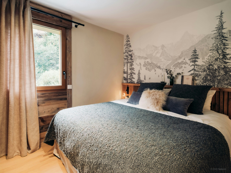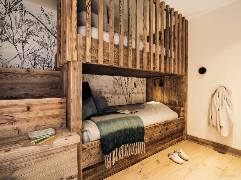 Le couloir d’entrée mène à l’espace nuit, composé de trois chambres doubles chaleureuses, et d’un dortoir avec lit superposé pour deux enfants. L’une des chambres bénéficie d’une salle de bains privative avec toilettes, tandis que les autres se partagent une seconde salle de douche et des toilettes indépendantes.
