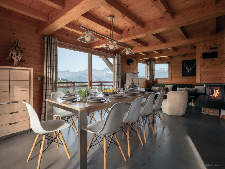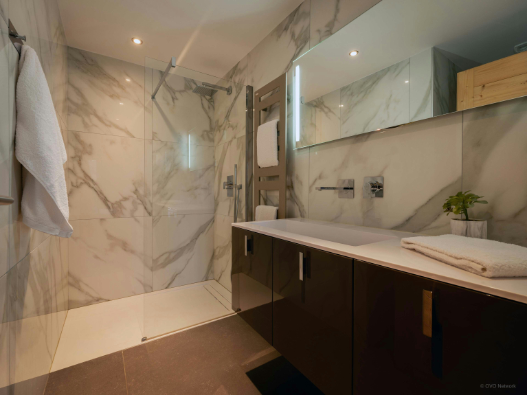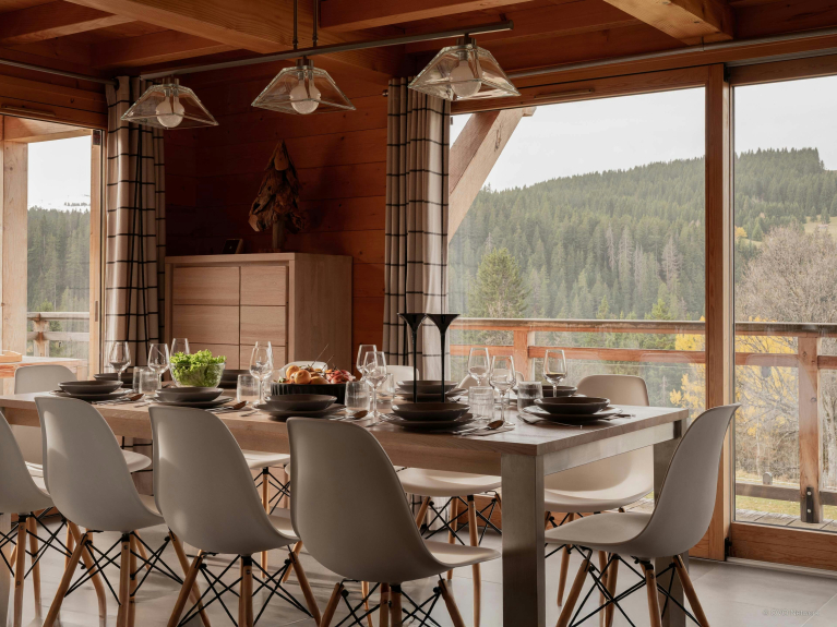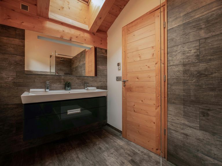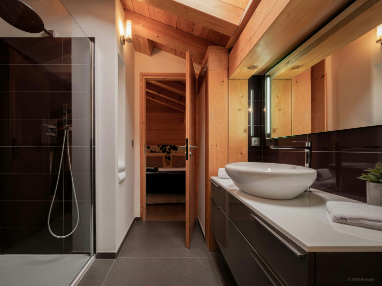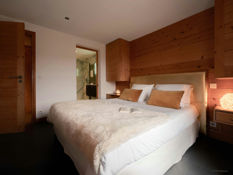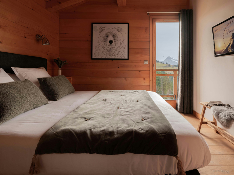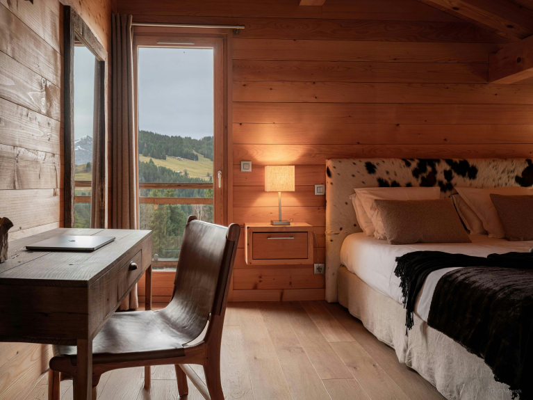 Au rez-de-jardin se trouvent deux chambres doubles et une chambre jumelle, tandis que l’étage supérieur compte une suite parentale et une autre chambre double. Toutes ces chambres bénéficient d’un accès direct à une terrasse ou un balcon, et trois d’entre elles possèdent une salle de bains privative. Les espaces de couchage du chalet sont donc particulièrement confortables. Vous trouverez également un bureau dans deux de ces chambres.