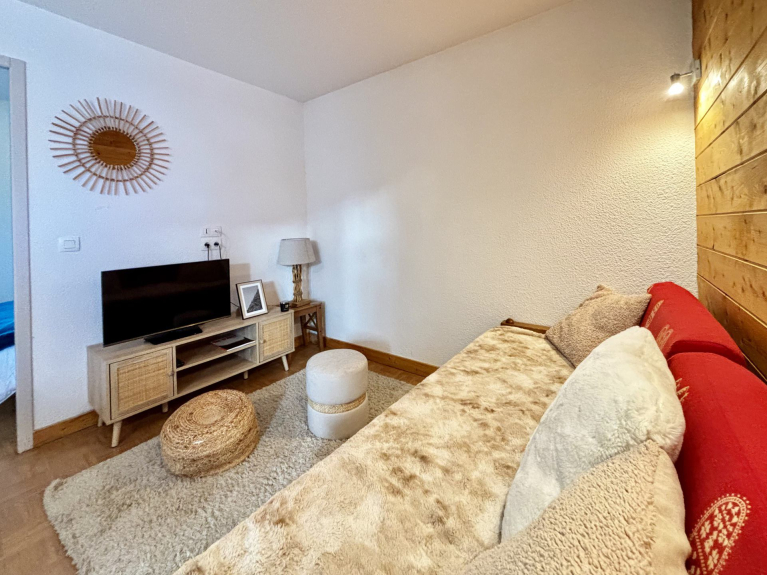 NOTRE AVIS : Appartement confortable et idéalement situé au pied des pistes, avec une grande terrasse ensoleillée et un accès à la piscine intérieure : un choix parfait pour un séjour pratique et agréable à la montagne.