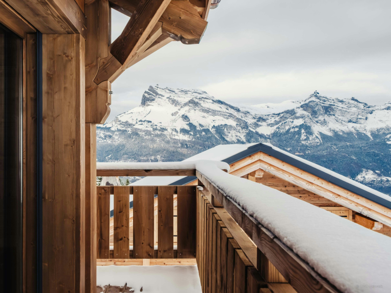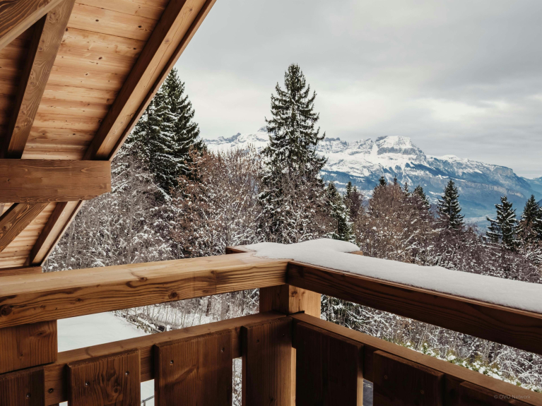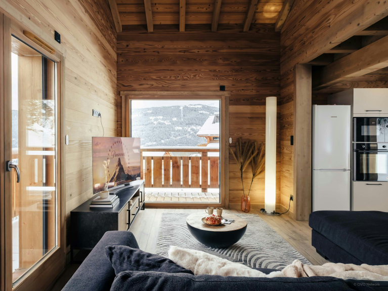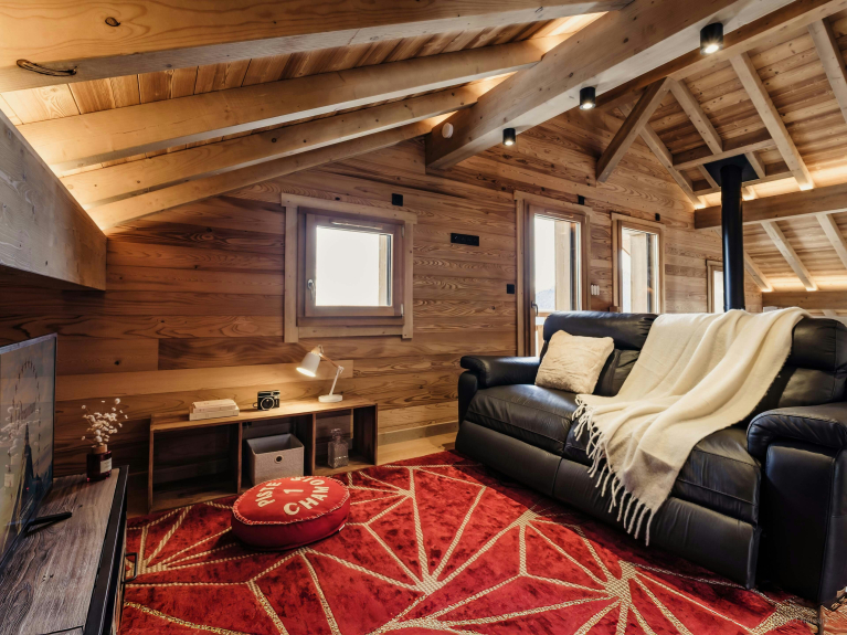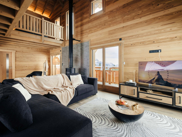 Le cœur du chalet est sa pièce de vie panoramique à l'étage central. Les baies vitrées enveloppent l’espace de lumière, un balcon file sur deux côtés et le poêle à bois réchauffera les soirées d’hiver.