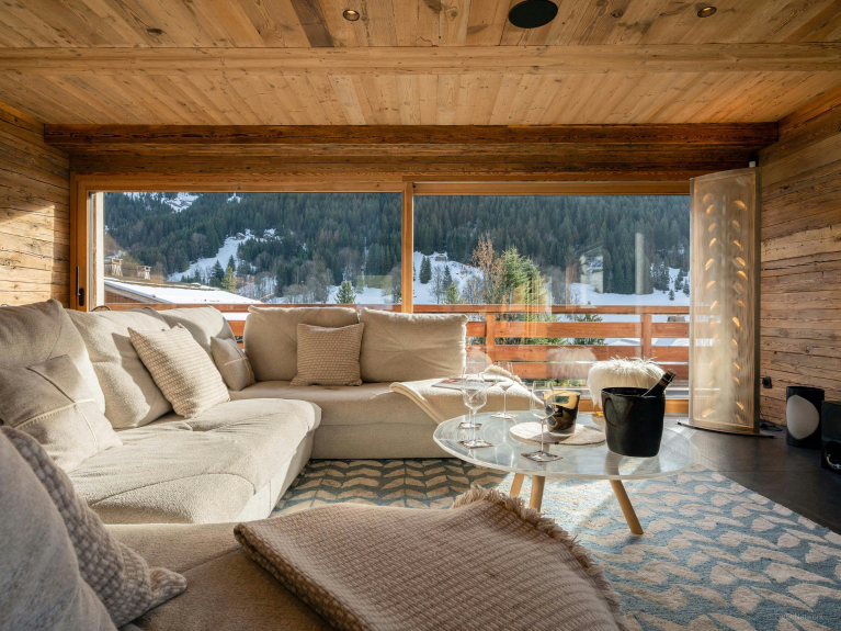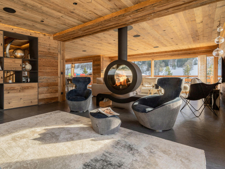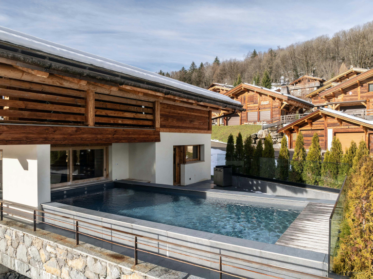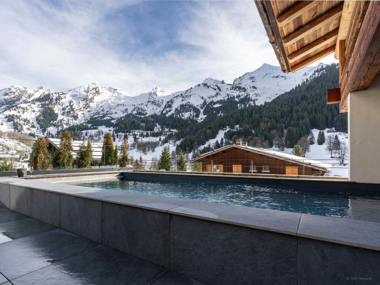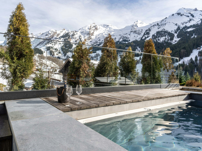 Les baies vitrées de cette vaste pièce de vie laissent entrer le paysage. À l’extérieur, sa piscine chauffée offrira d’agréables moments de détente face aux montagnes, été comme hiver.