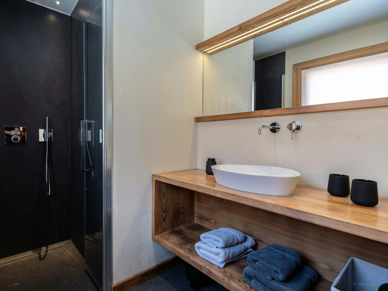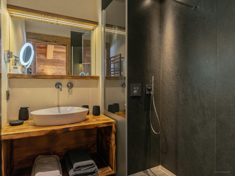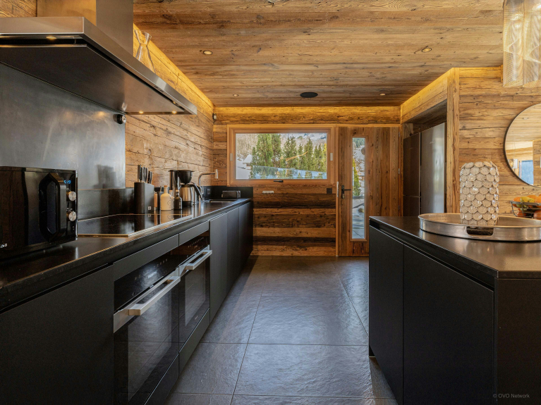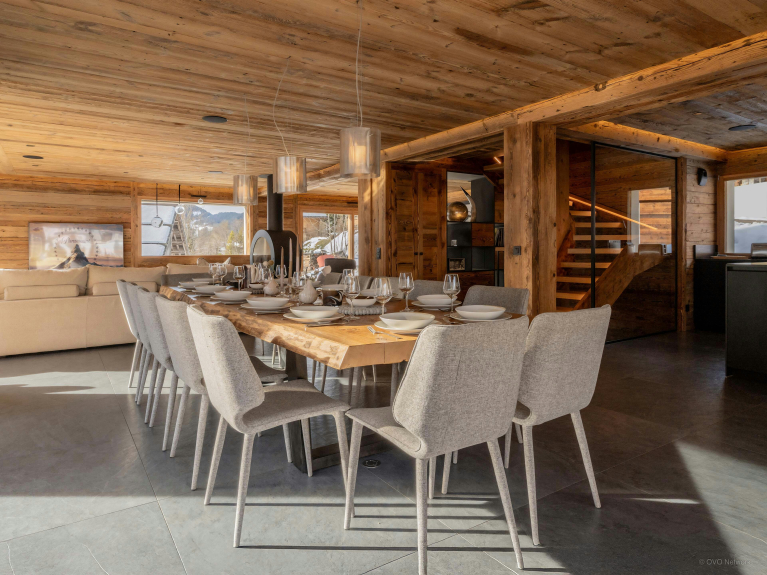 Pensé pour simplifier le quotidien, le chalet dispose également de son local à skis avec sèche-chaussures chauffant, de sa buanderie et de solutions de stationnement pratiques.