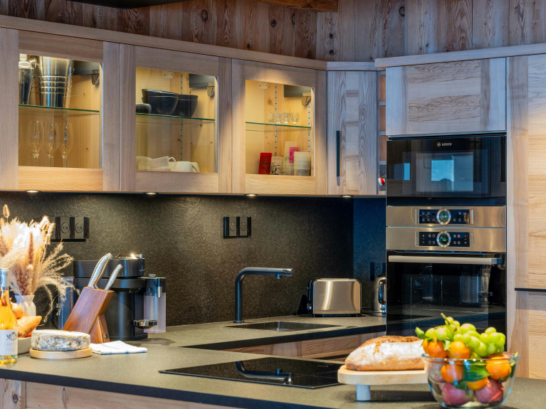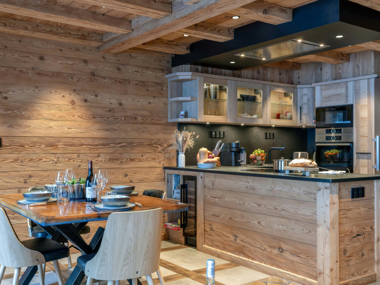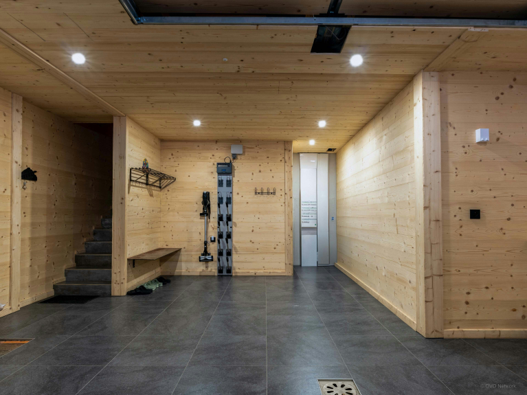 Le garage fait office de sas pratique pour les retours de ski ou de randonnée, avec son espace dédié aux équipements et son sèche-chaussures chauffant.