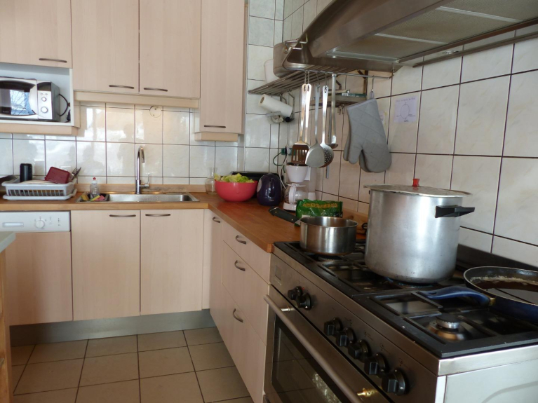 Au rez-de-chaussée du chalet, vous pourrez profiter de la grande cuisine équipée pour 15 personnes avec de vraies grandes casseroles, de la grande table de séjour et du salon avec ses canapés confortables. A ce niveau, il y a également un dortoir de 5 lits attenant à une salle d'eau et une chambre double avec un grand lit.