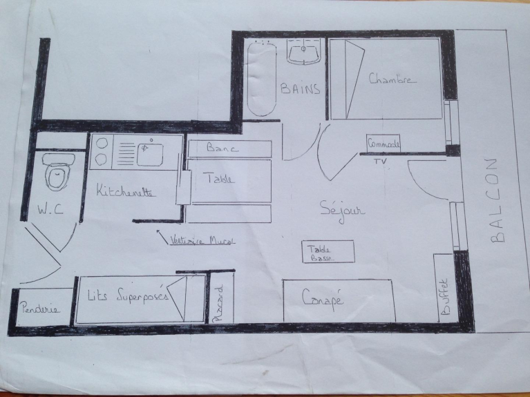 - Séjour: canapé-lit gigogne 2 couchages, 1 placard, télévision, buffet, table et une table basse