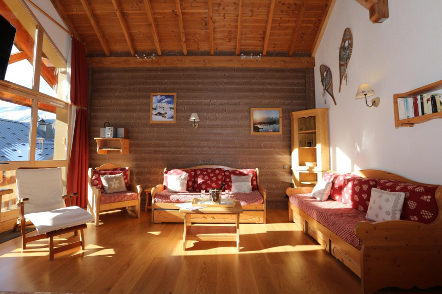 Au 3e étage de ce chalet, le salon exposé Sud prend toute la lumière et fait face aux pistes de la Setaz;