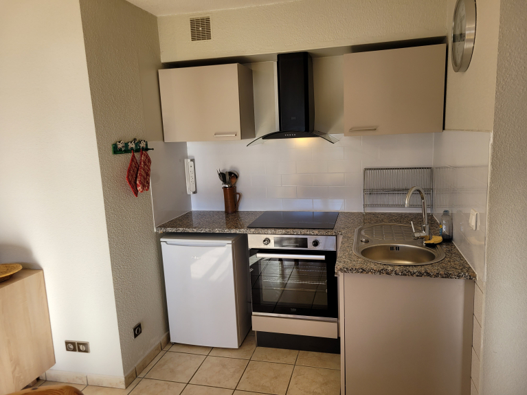 Séjour, canapé lit 140, coin cuisine, une chambre avec un grand lit.