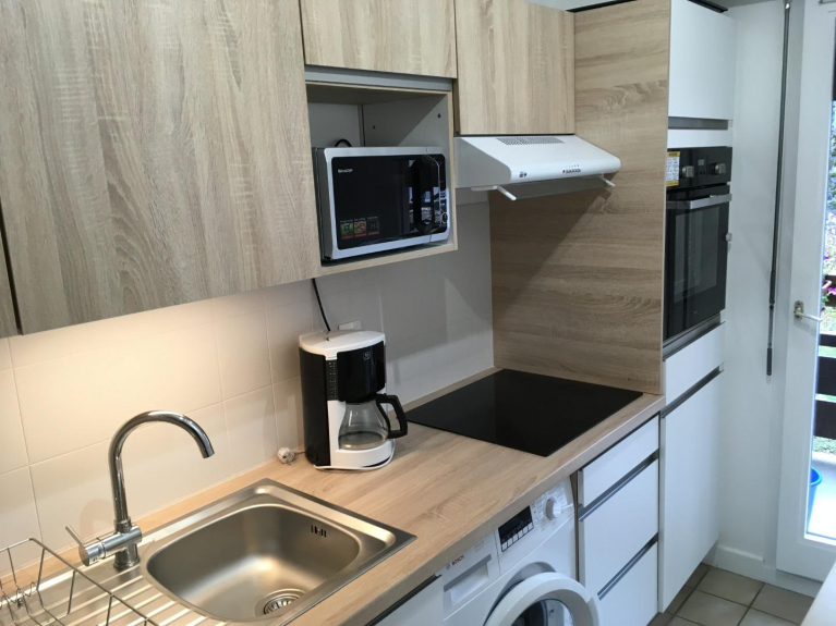 cuisine séparée super équipée.Chambre 1: Deux lits 90X200 soit 180cm , grand canapé lit en 160 dans le salon. Salle de bains, baignoire avec douche.