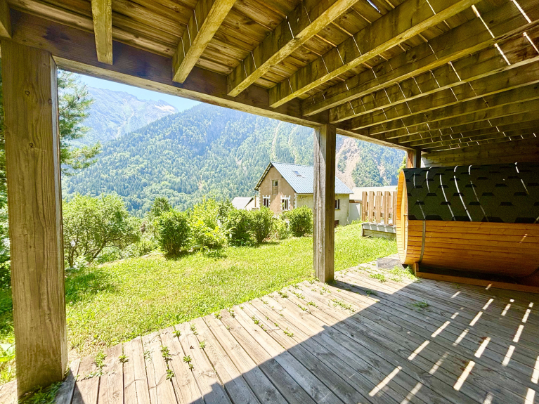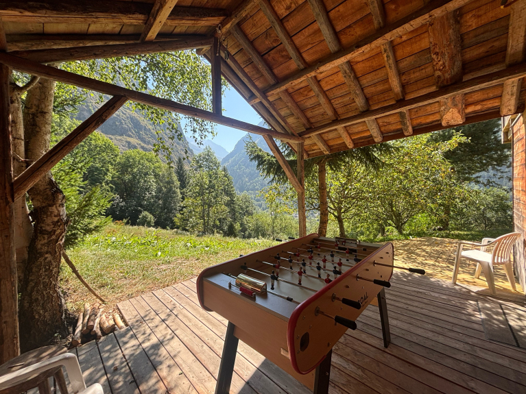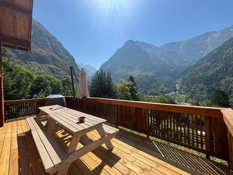 Terrasse panoramique avec barbecue, vue sur la cascade et la Roche de la Muzelle.