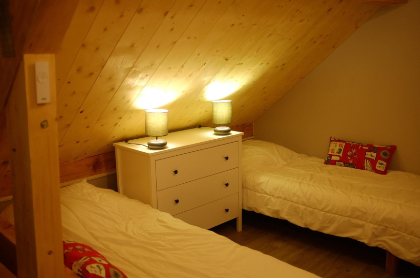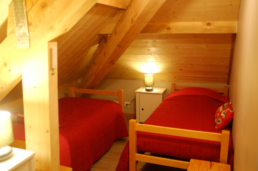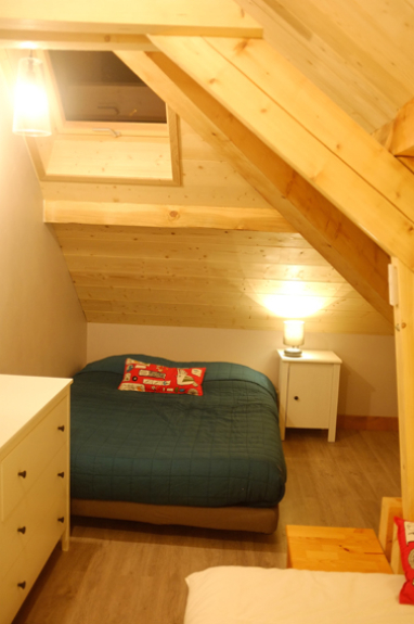 Côté nuit, l'Aigle possède 3 chambres et 1 mezzanine pouvant servir de chambre d'appoint. A l'étage, l'architecture atypique met à l'honneur la charpente avec une chambre mansardée, la chambre PLUME, qui possède un lit double et deux lits simples, et une deuxième chambre, la chambre TOTEM, avec 3 lits simples. La troisième, la chambre CELESTE, située au rez de chaussée avec un lit double peut facilement accueillir un lit bébé en complément (lit parapluie à disposition). Enfin, 2 salles de bain avec baignoires et 2 WC complètent l'agencement de l'Aigle.