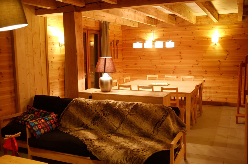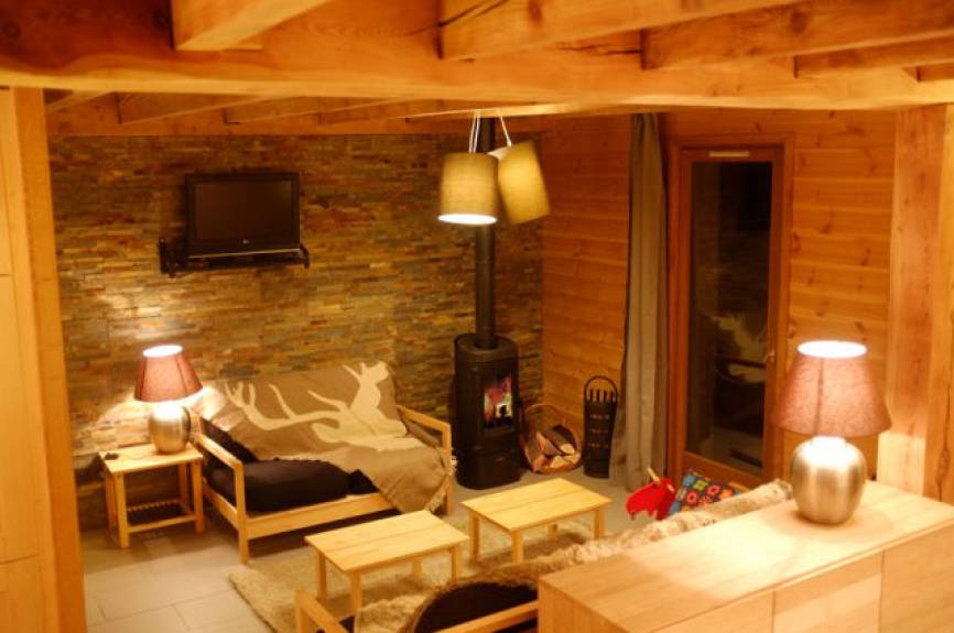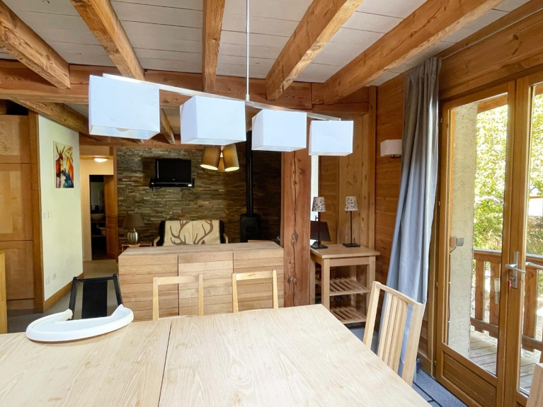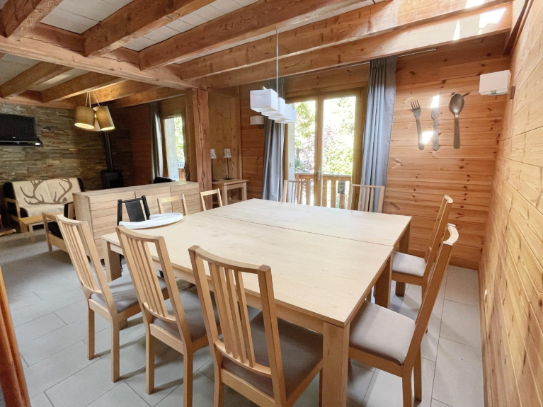 Côté jour, l'Aigle dispose d'un espace de vie prolongé à l'extérieur par une grande terrasse en bois avec barbecue électrique et une table pour partager des repas au soleil. La cuisine est entièrement équipée (four/MO, lave linge, lave-vaisselle, nespresso, machine à café traditionnelle, grille-pain, bouilloire, appareils à raclette, fondue...). Dans un esprit bois et poutres apparentes, une imposante table carrée favorise la convivialité. Le salon allie le bois et la pierre dans un esprit chalet, renforcé par un poêle à bois (bois à disposition).