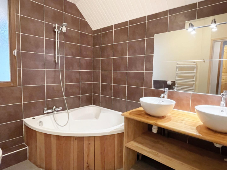 L'Aigle doit son nom à sa localisation. Niché au plus haut de la bâtisse, il bénéficie d'une magnifique vue sur la montagne, surplombant les toits de Venosc. L'Aigle a une entrée de plain-pied avec le jardin et la piscine.