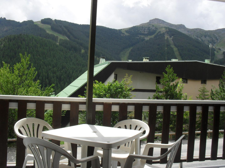 Le grand balcon (10 m²) orienté plein sud offre une vue magnifique sur la montagne et les pistes et la possibilité de manger ou de se reposer au soleil lorsque le temps le permet (Auron bénéficie d'un bon niveau d'ensoleillement même l'hiver).