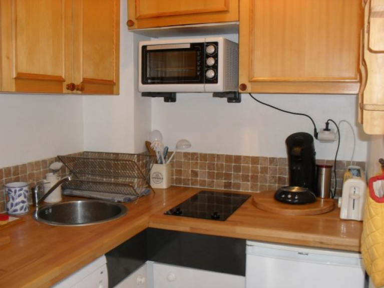 La kitchenette est bien équipée avec un lave-vaisselle, réfrigérateur, mini four, bouilloire, grille-pain, cafetière Senseo, appareil raclette.