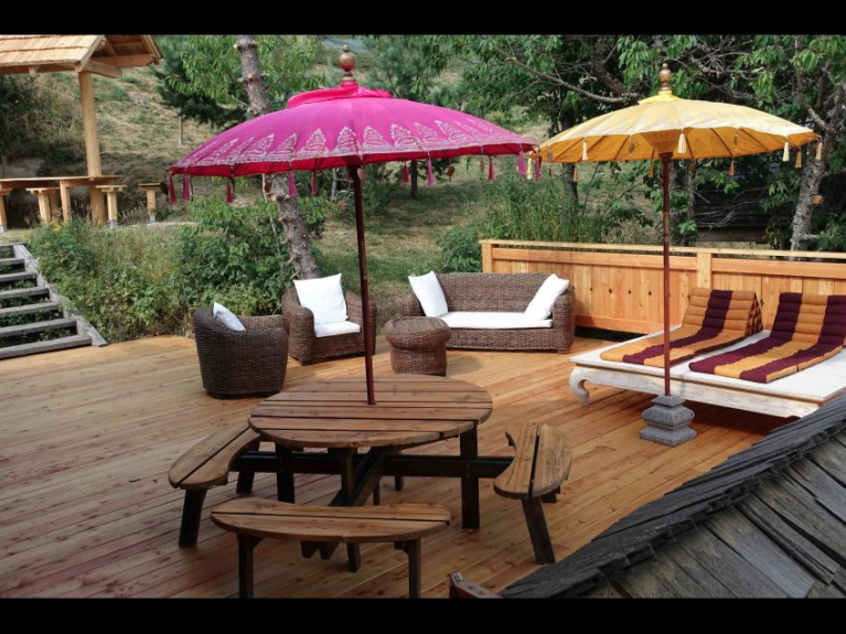 Extérieur même niveau: bûcher-bar de 30m2; terrasse bois 60m2 avec table ronde 8 places; larges balcons tout autour du chalet avec hamacs et chaises longues + terrasse de 200m2.