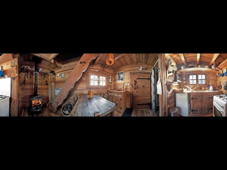 Ambiance chaleureuse et intime dans ce tout petit chalet en bois construit sur le modèle des mazots suisses ; surface habitable : 22 m2
