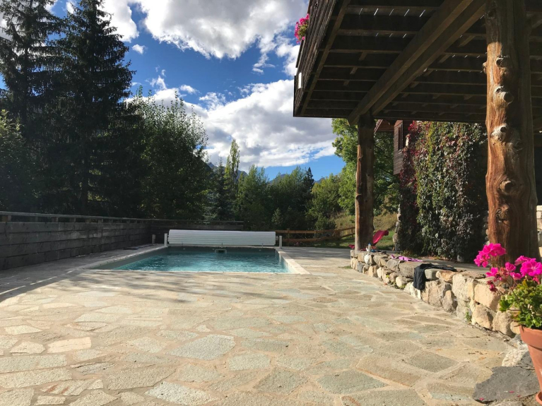 Le chalet en pierre de la Guisane et mélèze est constitué de 3 niveaux pour une surface habitable de 420m2 sur un vaste parc arboré de 6000 m2 entièrement clôt avec portail télécommandé. Vue superbe sur les bois et les pistes de SERRE CHEVALIER, en face du chalet, orienté plein sud. Les pistes sont à 5 minutes en voiture, navette gratuite ttes les 1/2 H à 200 M.Construit par Henri COLBOC, grand prix de Rome, c'est une vaste demeure accueillante et chaleureuse ou il fait bon vivre. Idéalement situé,tout confort,cheminée panoramique, bow window, Bureau avec connexion Wifi, Sauna Infrarouge, Billard américain, grande terrasse de 100 m2 à l'étage accès séjour-salon, garage 2 voitures. Entièrement rénovée, en plein coeur de la station de SERRE CHEVALIER. Il est équipé d'une piscine d'été chauffée ( du 20 juin au 21 septembre) par une pompe à chaleur et protégée par un volet roulant, avec douche solaire, sur une grande terrasse de 160 M2.Chalet 12 - 18 personnes. 11 pièce(s) , dont 7 chambre(s), Cuisine américaine, Salon, Salle à manger, Bureau, 1 salle de bains, 4 salles d'eau, 2 WC indépendants, Terrasse, Balcon.Après une journée de ski, de balade en montagne, ou simplement pour votre bien être, profitez de son Sauna Infrarouge 4 places ainsi que de son billard américain et l'été un bon bain dans la piscine.