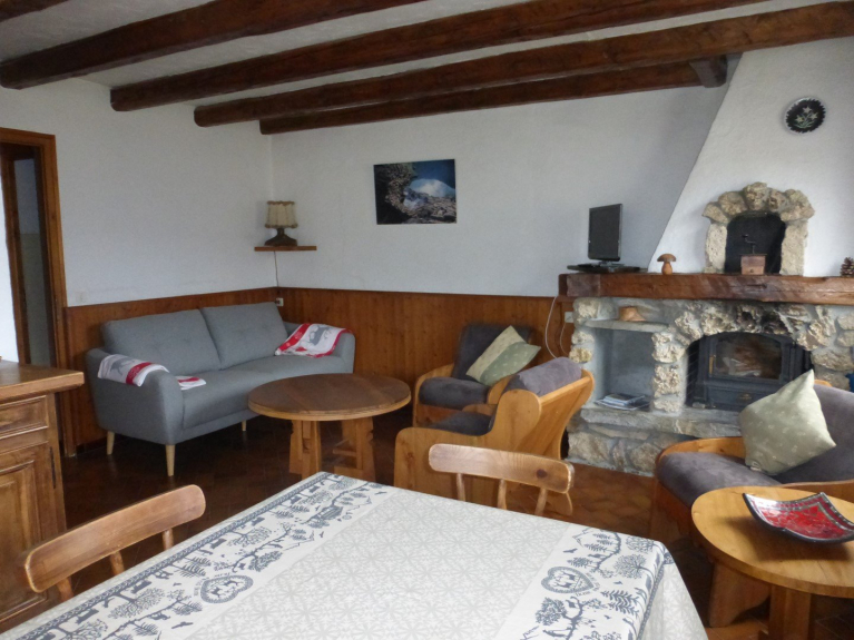 un grand séjour avec coin salon-télévision, coin repas, cheminée (bois non fourni)