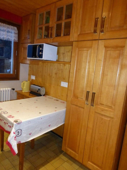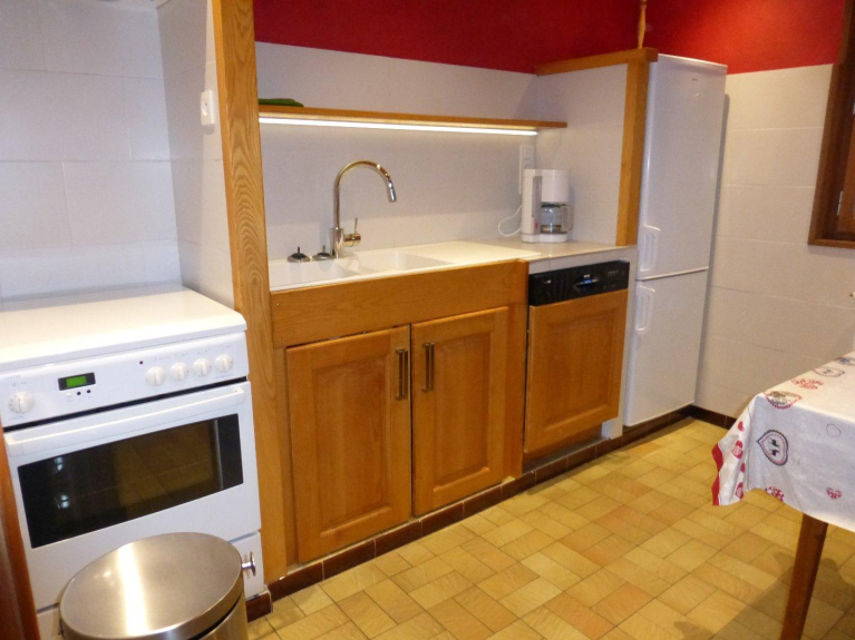 cuisine équipée four électrique, micro-ondes, lave vaisselle, lave-linge, refrigérateur avec congélateur 3 tiroirs en bas, appareil à raclette et à fondue. petit électro ménager (grill pain, bouilloire électrique, mixeur-fouet, presse légumes etc)