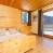 La grande salle à manger lumineuse avec salon et coin cheminée est située au 2ème étage, ainsi que la cuisine américaine. On y trouve également une chambre double avec grand lit ainsi qu'une petite chambre simple composé d'un seul lit, également une salle de bain avec douche et lavabo et un WC séparé. Le salon donne accès sur une grande terrasse avec l'espace de détente avec sa cabane de sauna et jacuzzi extérieur. Ce sauna privatif est situé à côté du jacuzzi et comprend une cabine de sauna pour 4 à 6 personnes ainsi qu'une douche.