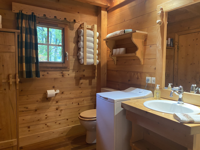 Le Bothy est à 100m des autres chalets. Les toilettes sont dans la salle de bain et place de parking exterieur mais grand jardin avec balançoire, cabane dans l'arbre et petit chalet pour enfants plein de jouets.
