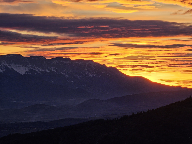 Panoramisch uitzicht op de Pyreneeën (150 km bergen van Canigou tot Sierra del Cadi).