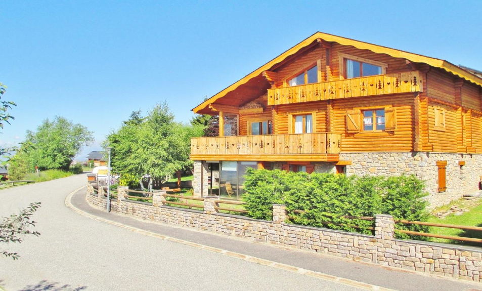 Fins chalet van massief hout (boomstammen), stenen sokkel en veranda op de begane grond. Op het zuiden in een woonwijk.