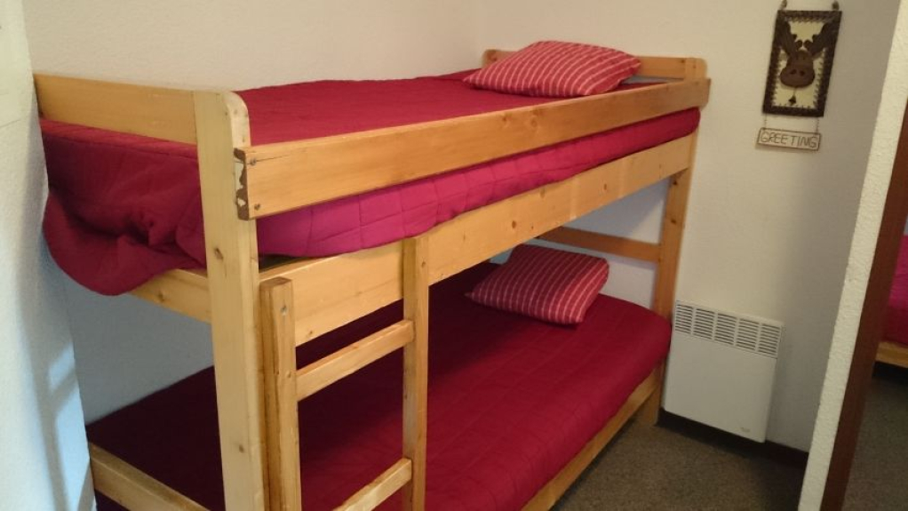 Een berghoek met 2 stapelbedden, een woonkamer met een tweepersoonsslaapbank, en een slaapkamer met een tweepersoonsbed en nieuw bultex beddengoed.