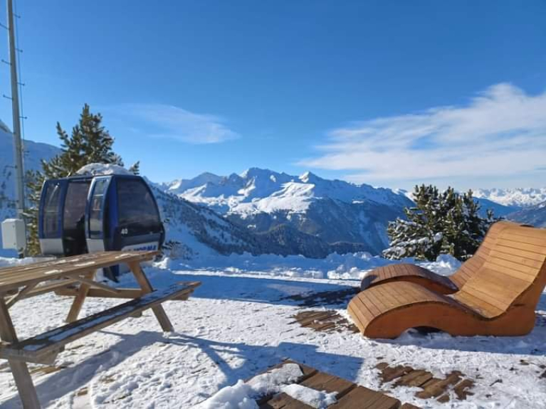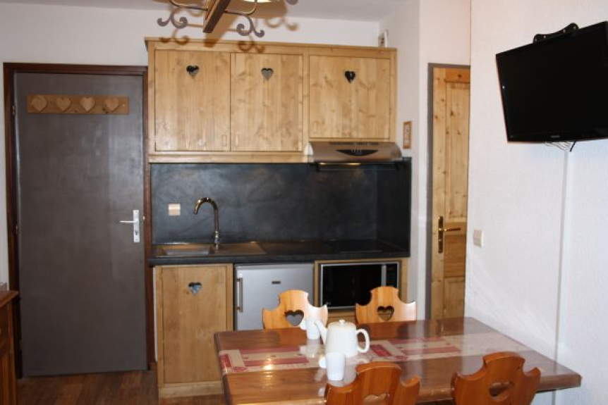 slaapt, ingericht in bergstijl. Appartement met balkon, zeer licht dankzij de zuidelijke ligging en het aangename uitzicht op het hart van het resort, op de berg en de pistes. Bestaande uit een woonkamer met keukenhoek, slaapkamer, badkamer met raam, apart toilet, balkon met ligstoel.