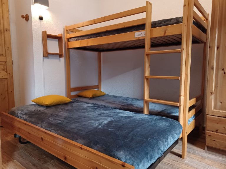 - Slaapkamer met stapelbed en uitschuifbaar bed: 3 slaapplaatsen, bergkast.