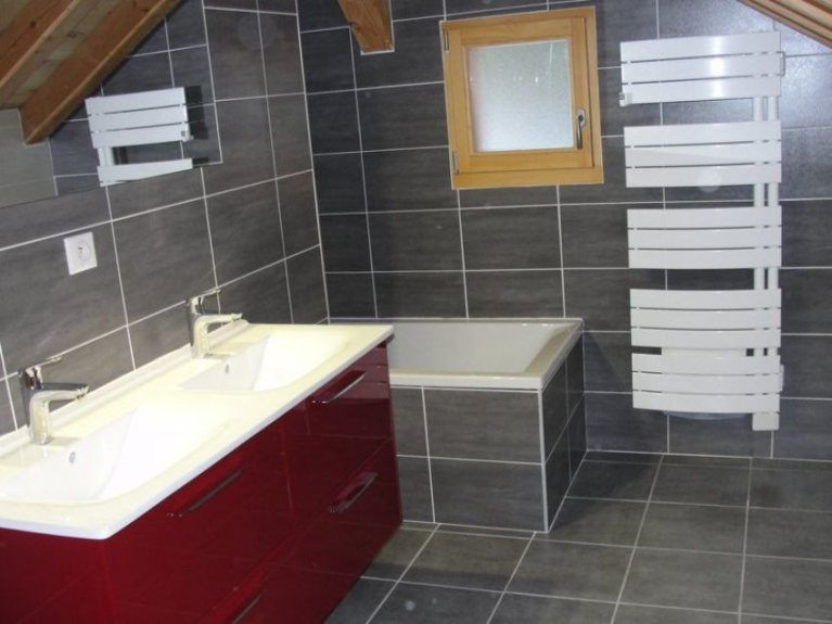- badkamer, met groot bad/douche en wastafel op meubel: dubbele wastafel