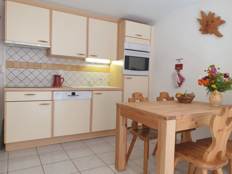 De keuken is voorzien van een keramische kookplaat, een afwasmachine, een elektrische oven, een magnetron en een afzuigkap.