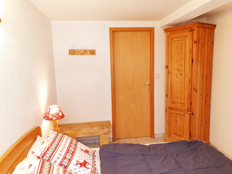 - een slaapkamer met een tweepersoonsbed uitgerust met 4 kussens en een dekbed 220 X 240, evenals een bergkast
