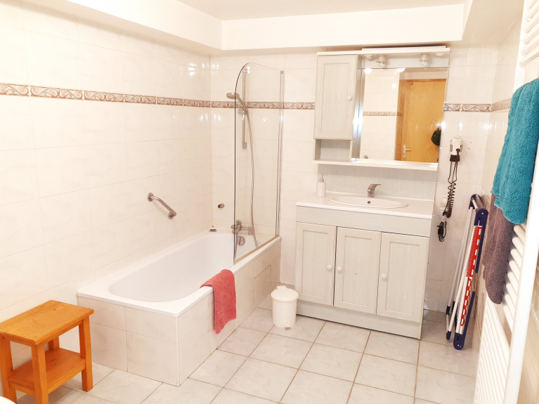 - een badkamer met een wastafel, een bad met douchescherm en een toilet.