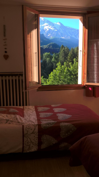 Omzoomd door een bos, een bergstroompje beneden (watertoevoer van de Mont Blanc) en een paar chalets.