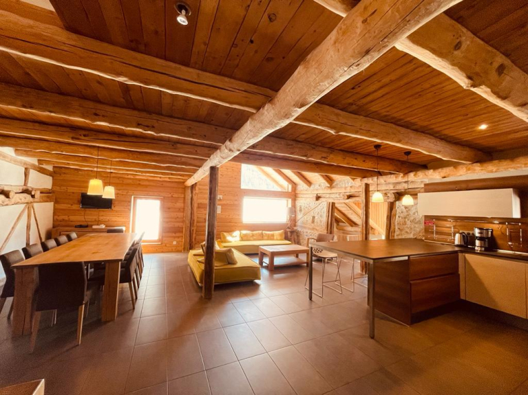 Grote woonkamer met salon en TV, 5 slaapkamers, 5 badkamers. (2 tweepersoonsbedden en 8 eenpersoonsbedden, 1 babybed). Badkamer met 2 toiletten, LV, LL. Schoonmaakpakket beschikbaar. Het warme interieur, gemaakt van lariks en steen, is ideaal voor familiebijeenkomsten in deze grote woonkamer met zijn open keuken.