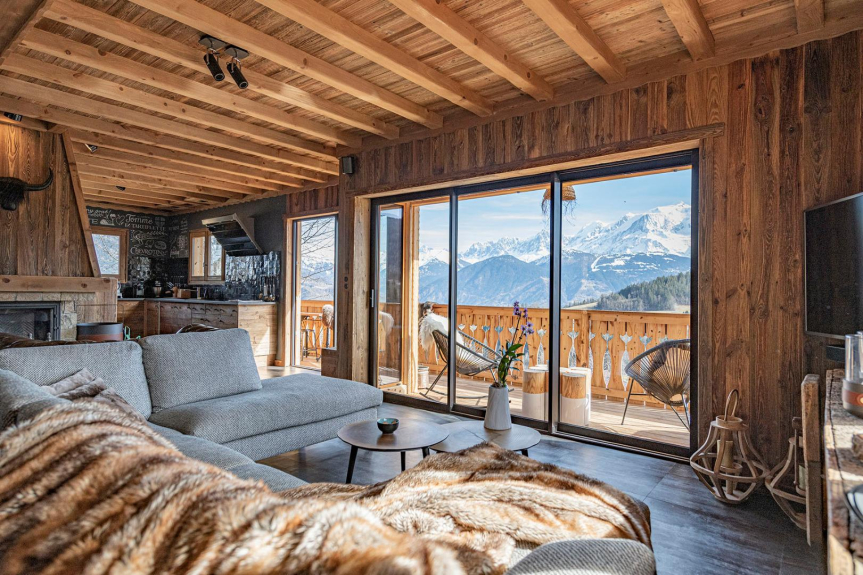 De grote woonkamer is gebouwd rond een centrale open haard. Met uitzicht op het Mont Blanc-massief scheidt niets u van het dak van Europa. Van de Aiguilles de Warrens tot de Mont-Joly ontvouwen de bergen zich in al hun pracht voor een gigantische erker. In de zomer en winter kunt u op het royale balkon/terras van meer dan 250 m2 genieten van de plancha, de vuurkorf en de zon.