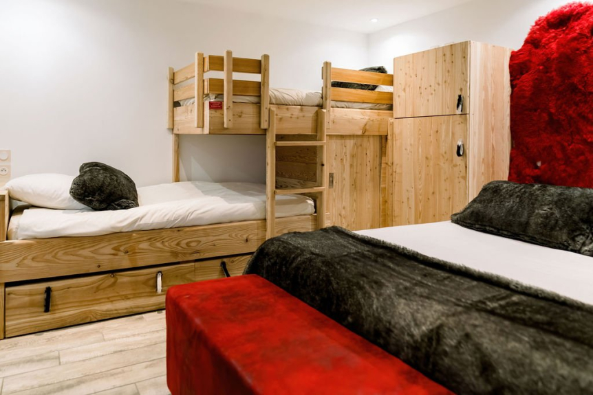 Een slaapkamer met een tweepersoonsbed 160 x 200, flatscreen en een gespreid stapelbed, kasten met fabrieksramen