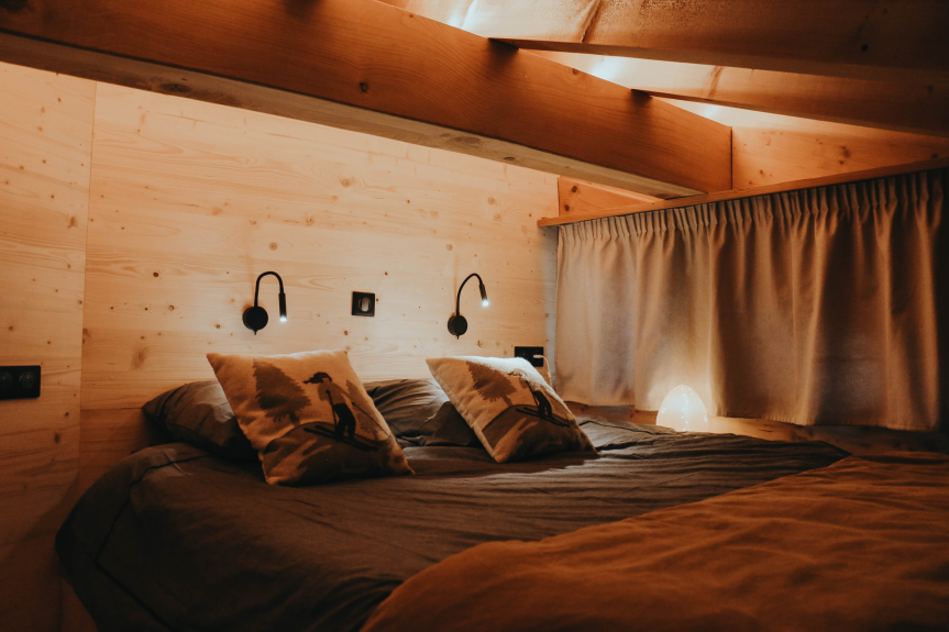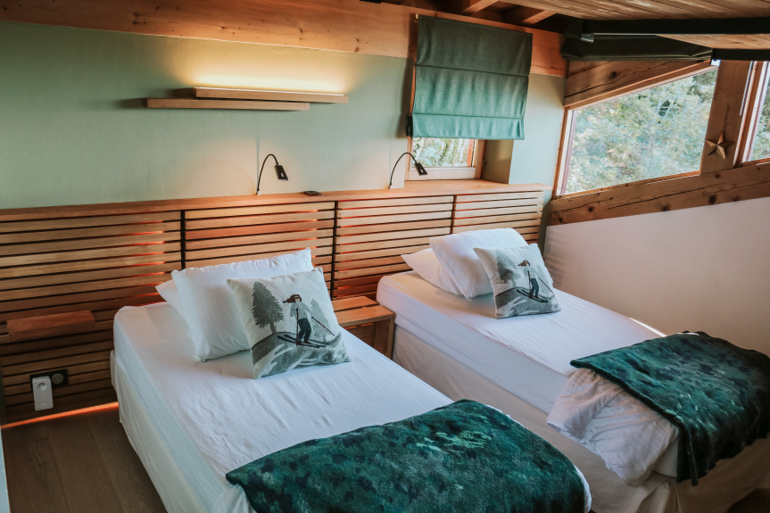 Slaapkamer 2: 1 tweepersoonsbed 180 x 200 (2 x 90) + 1 tweepersoonsbed 140 x 190 op een open mezzanine.