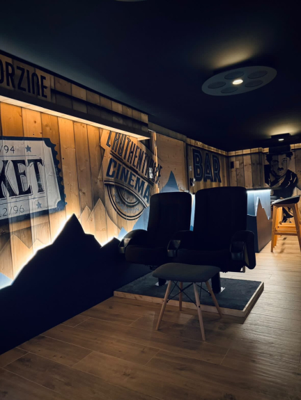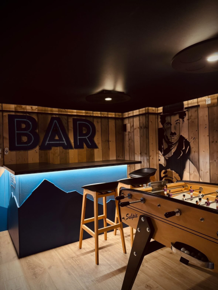 - bioscoopzaal met luidsprekers, DVD beschikbaar, Apple TV, XBox 360 met spelletjes beschikbaar, tafelvoetbal, bar