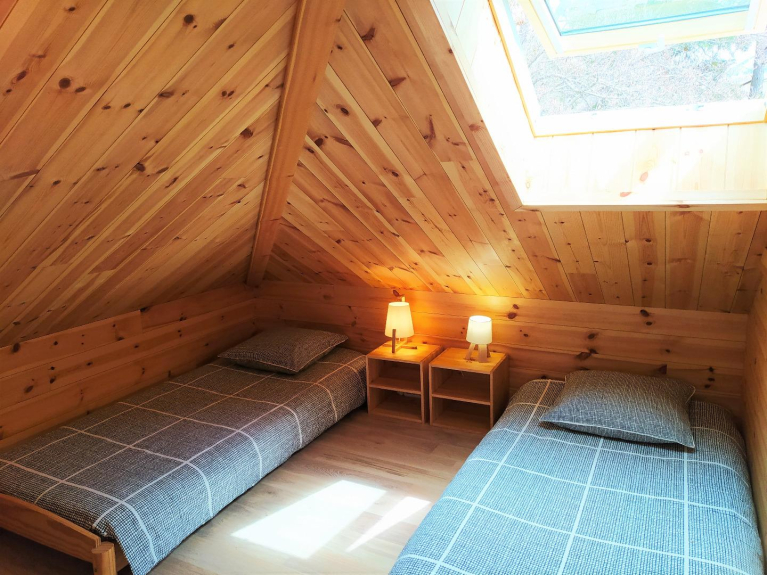 Op de eerste verdieping, een slaapkamer met twee eenpersoonsbedden en een mezzanine met zithoek en TV.