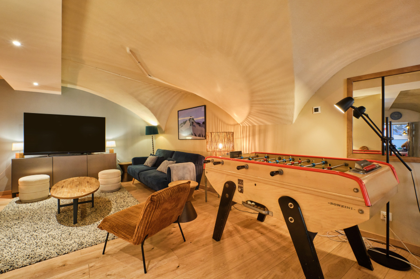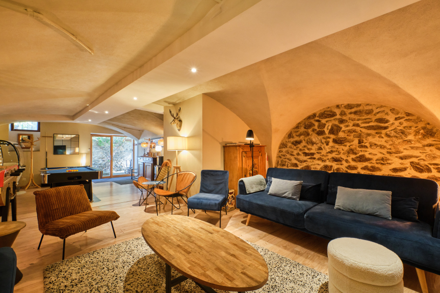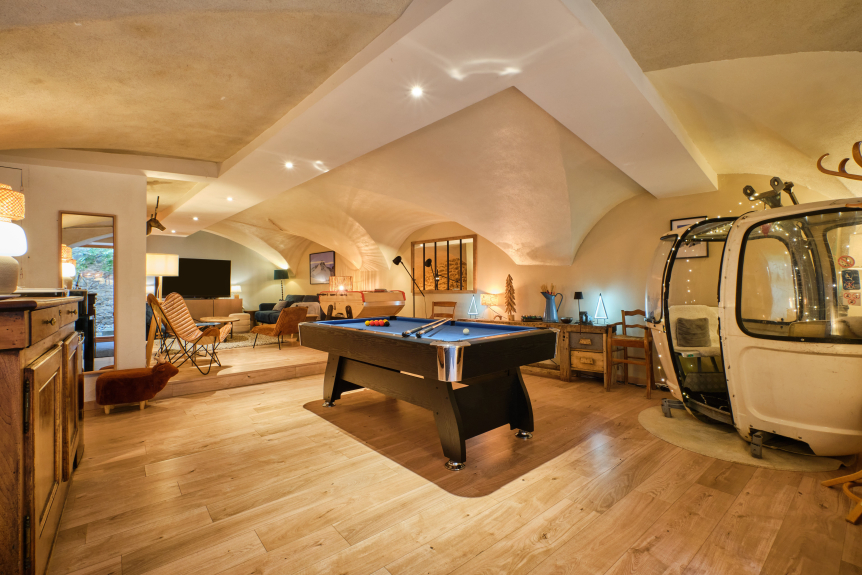 Geniet van de gewelfde plafonds van de grote woonkamer, een tafelvoetbal, de keuken / zithoek en houtkachel, een kinderhoek (spelcomputer / TV), sauna en massagetafel.