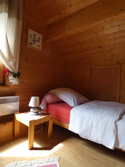 ruim, comfortabel houten chalet met een open haard. Zorgvuldig ingericht.