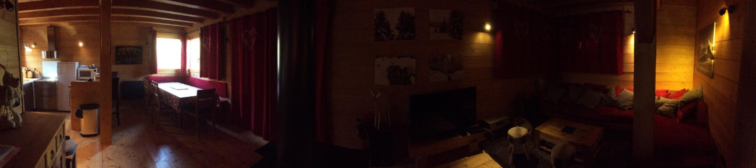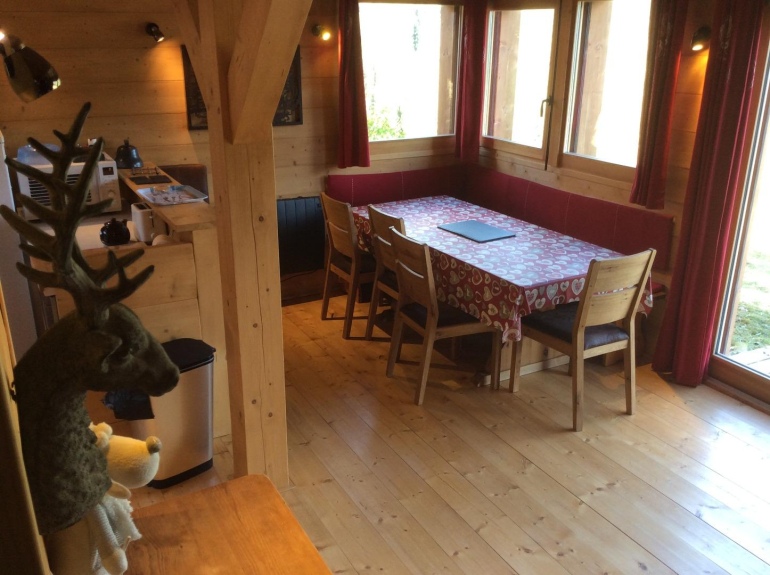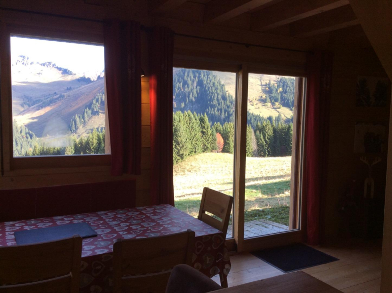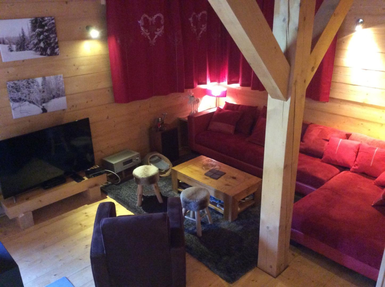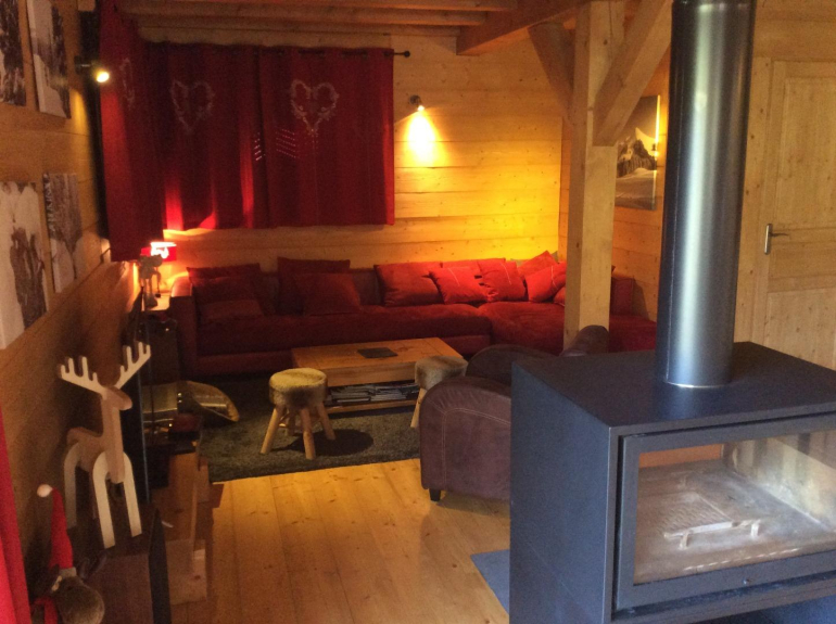 Chalet BARADOZ, gloednieuw, ideaal gelegen SKI TO FOOT, tussen de langlauf en alpine skipistes, met een prachtig uitzicht op de Huble en Chalune bergen. Het chalet beschikt over een grote woonkamer met een centrale kachel die in open verbinding staat met de zit- en eetkamer.